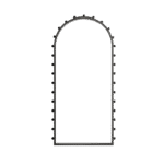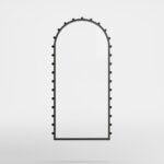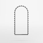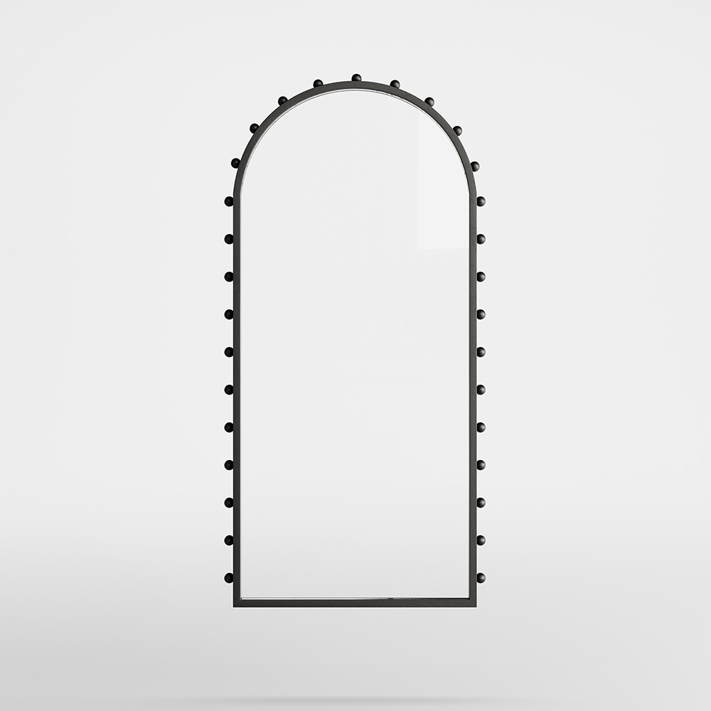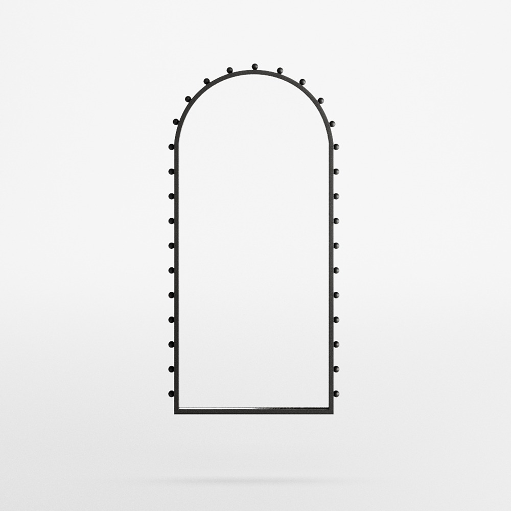 An arched frame cradles the round mirror like a silent threshold.Along its edge, circular beads create a quiet rhythm — a constellation of form that invites without demanding.